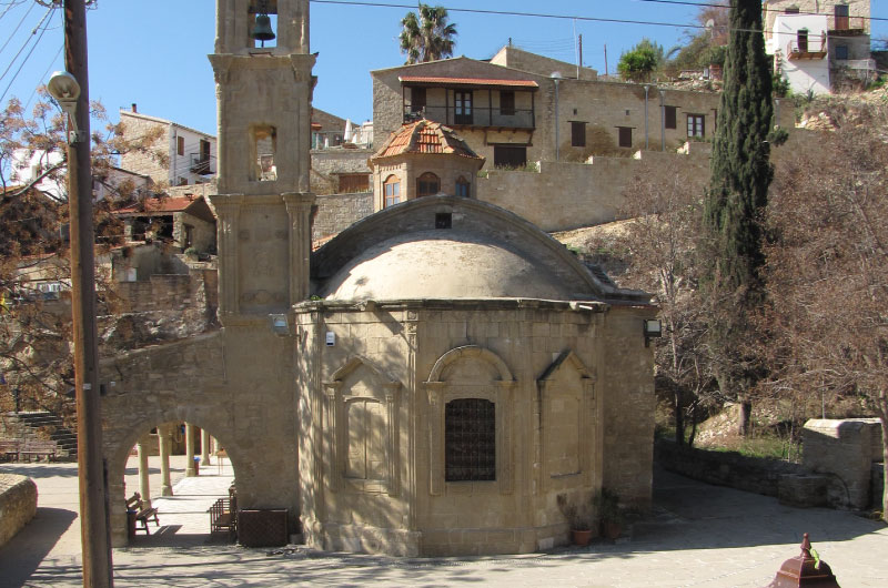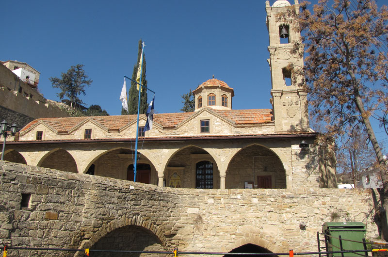 TThe Church is dedicated to Saints Konstantinos & Eleni , because it is believed that the initial small church was built by Saint Eleni , mother of Byzantine Emperor Konstantinos on her return from Jerusalem on her quest to find the Holy Cross in 326 A.C. Her ship stopped at Vasilopotamos , and she noticed that the Holy Cross was missing. She saw a light where the Church is now, she went there and found the Holy Cross. She built a church upon the bridge and in the following years the church was renovated and expanded to what it is today.